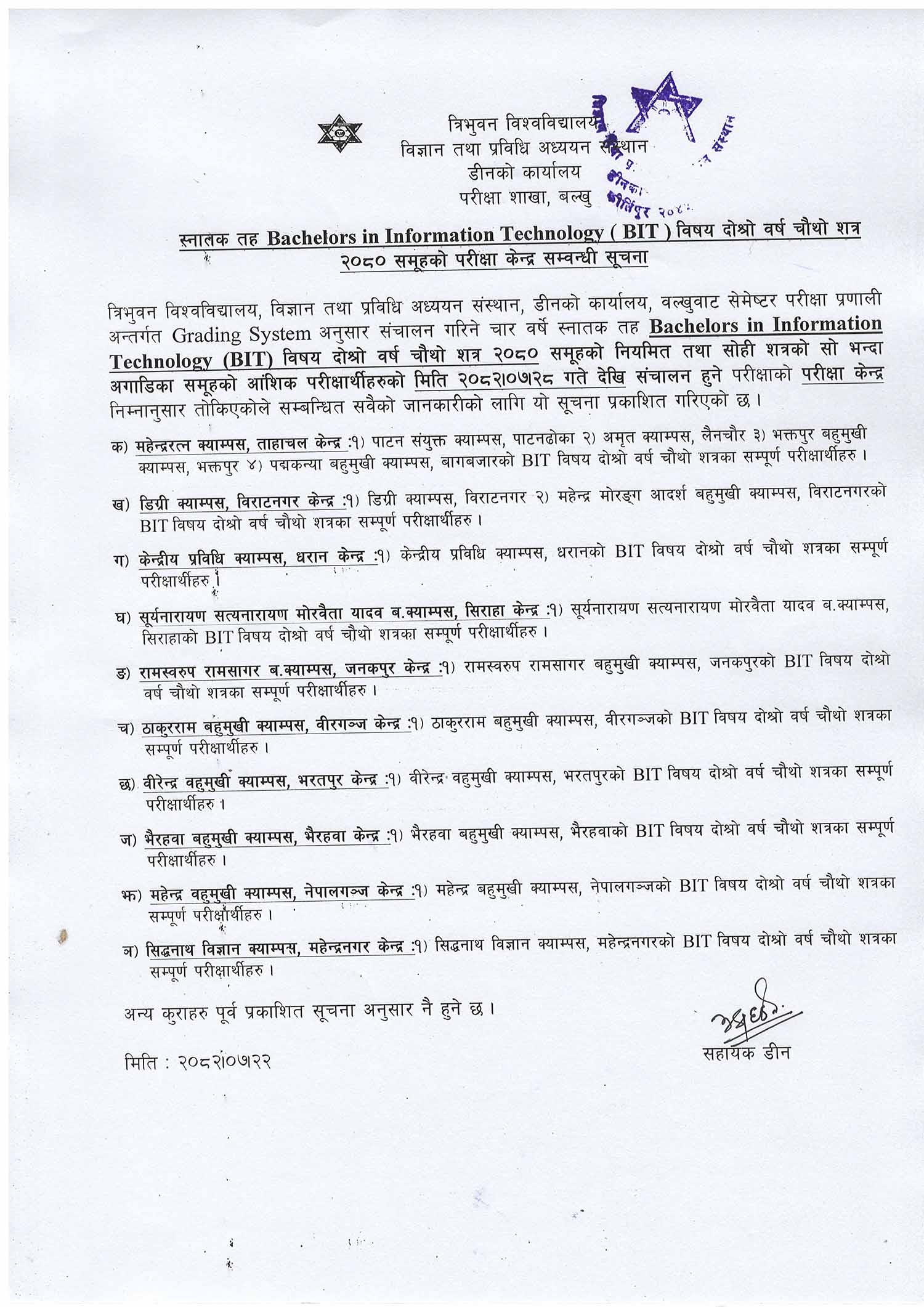 Tribhuvan University, Institute of Science and Technology, Dean's Office, Exam Department, Balkhu has published the Bachelor in Information Technology (BIT)Fourth (4th) Semester-2080 Exam Center 2082.