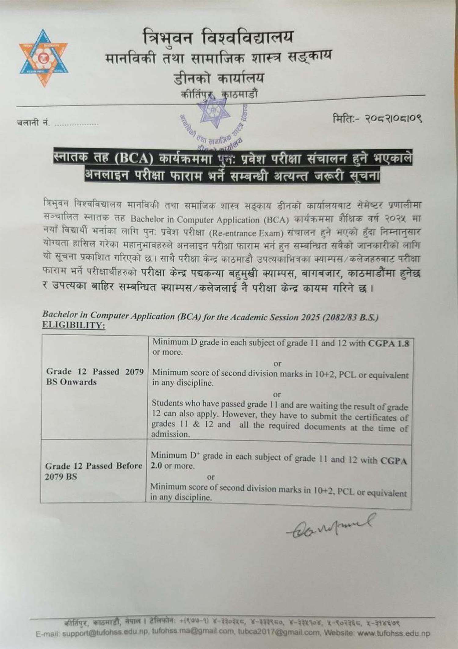 Tribhuvan University, Faculty of Humanities and Social Sciences, Dean’s Office has published the BCA (Bachelor of Computer Application) Re-Entrance Exam 2082 details.
