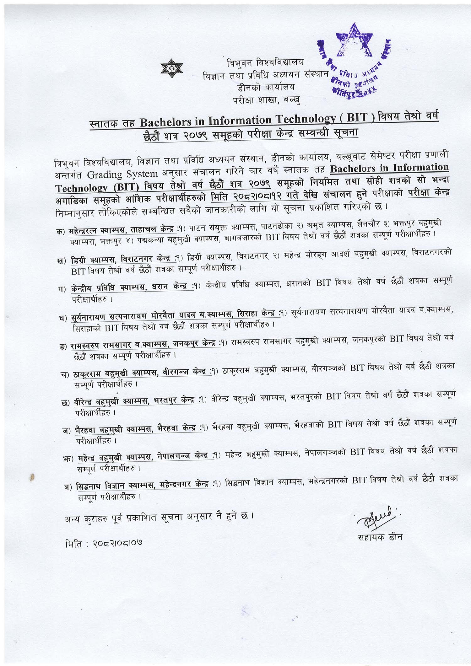 Tribhuvan University, Institute of Science and Technology (IoST) has published the Bachelor of Information Technology (BIT) Sixth (6th) Semester Exam Center 2082.