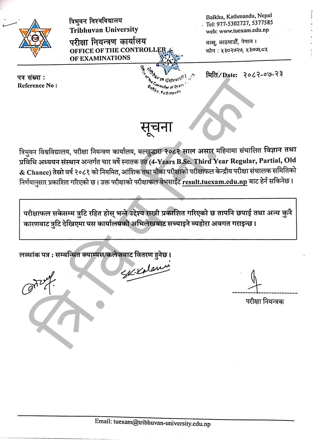 Tribhuvan University, Office of the Controller of Examinations, Balkhu has published the Bachelor of Science (B.Sc.) Third (3rd) Year Exam Result 2082
