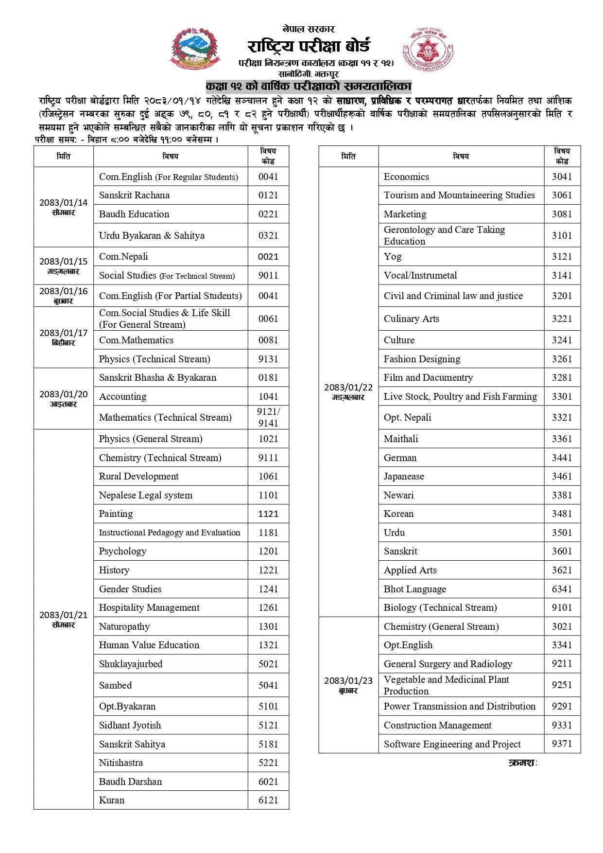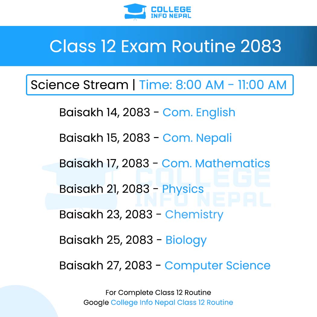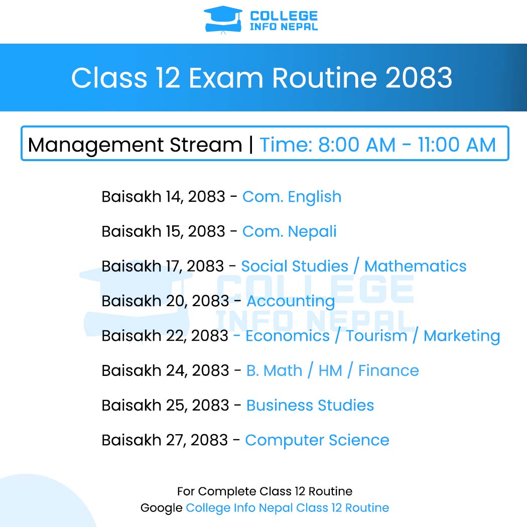 NEB (National Examination Board)has published the Class 12 Exam Routine 2083. Here we have included the Class 12 exam routine 2083 for Science, Management, Law, and Education.